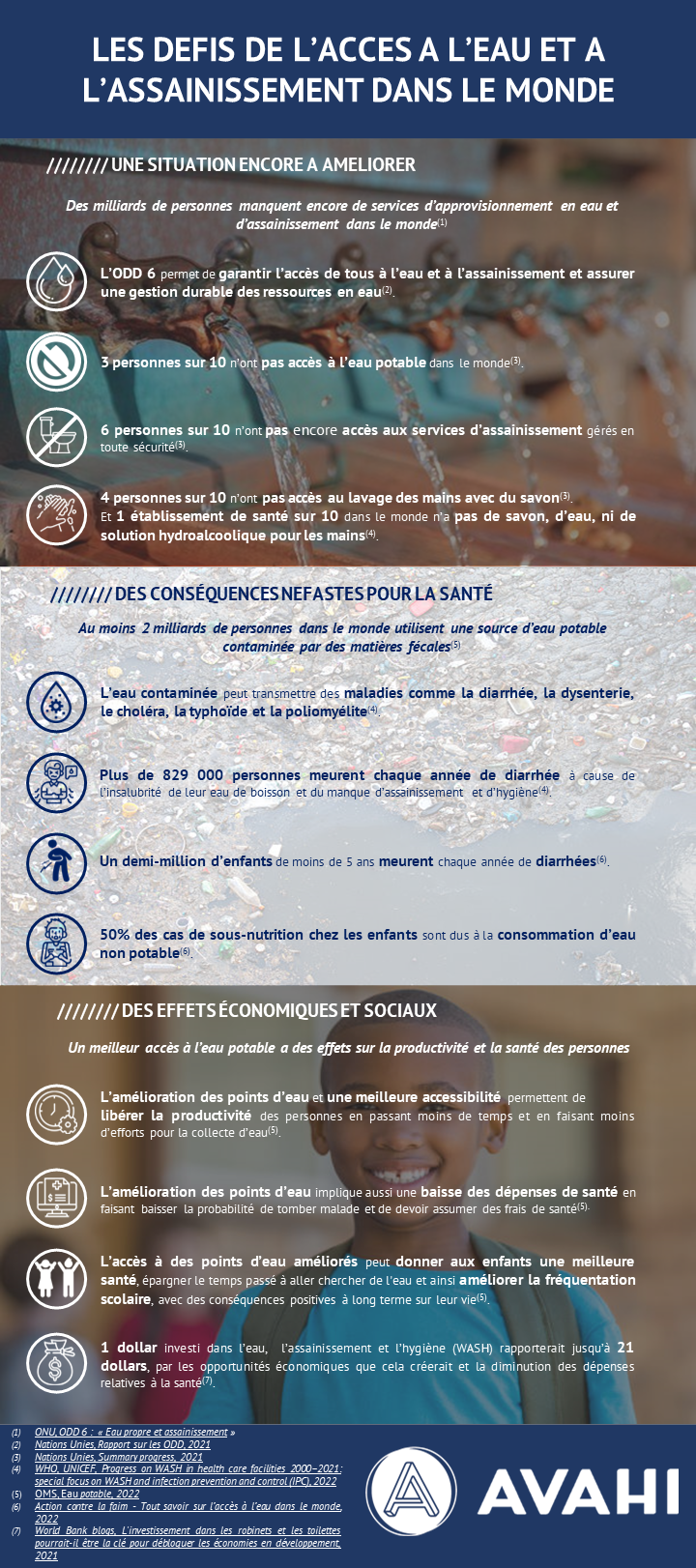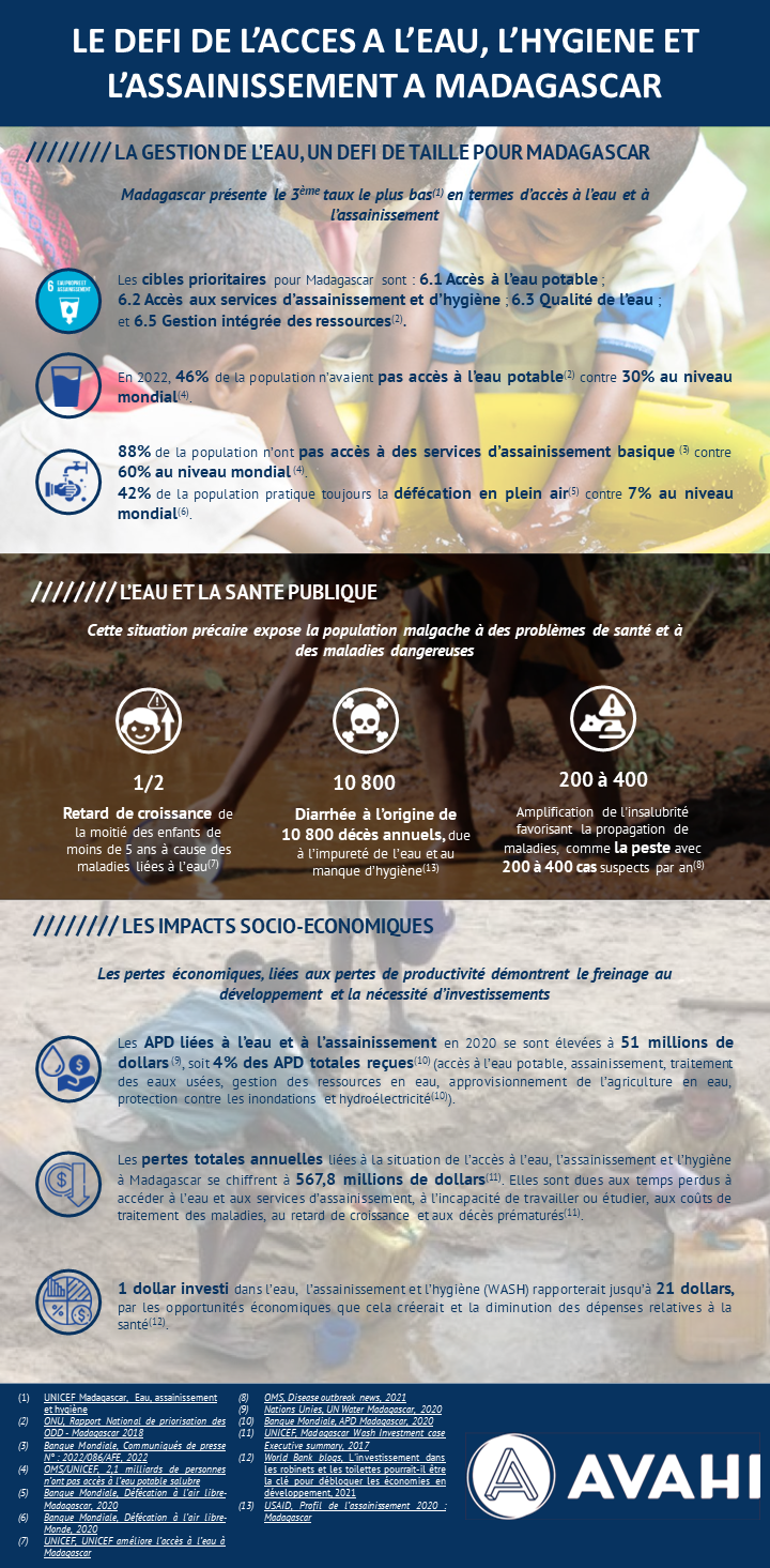 Tous les 22 mars, nous célébrons la Journée Mondiale de l’eau. A cette occasion, AVAHI vous partage une infographie sur les enjeux de l'accès à l'eau et à l'assainissement dans le monde, ainsi qu'une étude de cas sur Madagascar.
